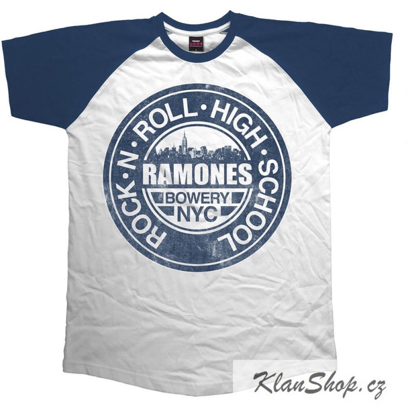 Pánské (unisex) bílé tričko s modrými rukávy Ramones Bowery NYC.