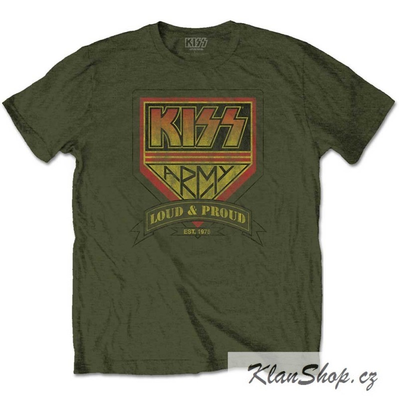 Pánské (unisex) armádní zelené tričko s krátkým rukávem Kiss Loud And Proud.
