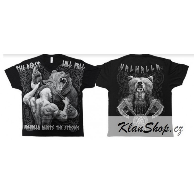 Pánské černé tričko - celopotisk - Viking bojující s medvědem.