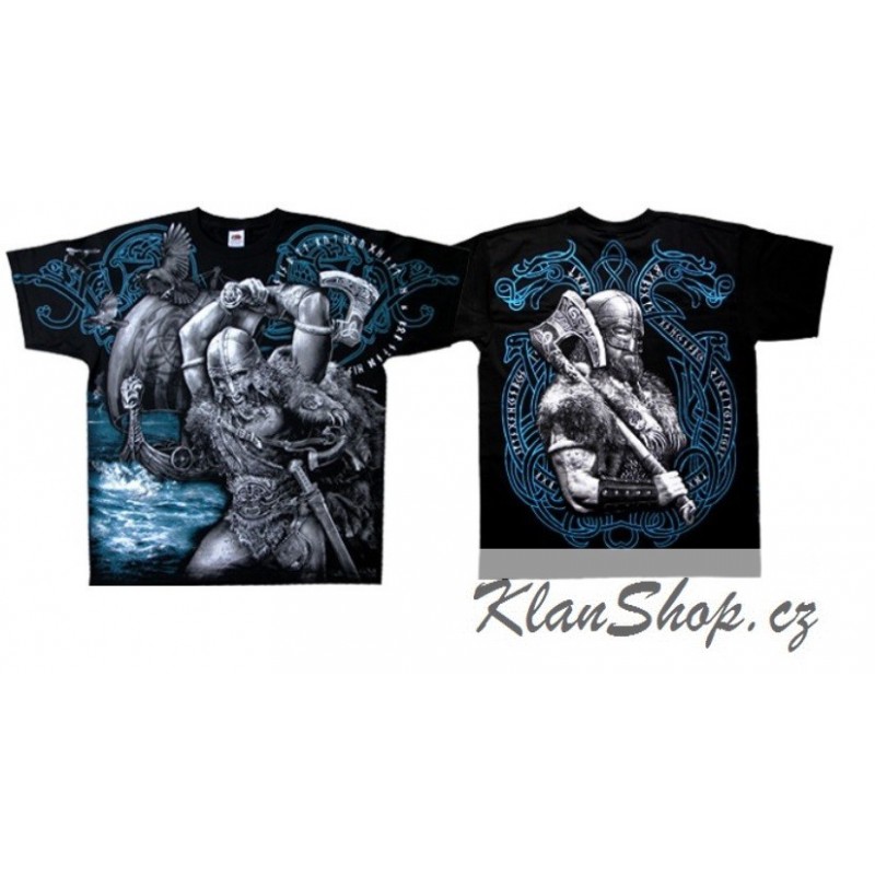 Pánské černé tričko - celopotisk - viking ve zbroji se sekyrou - loď Drakkar.